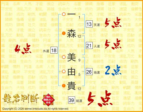 一(1画)森(12画) 美(9画)由(5画)貴(12画)