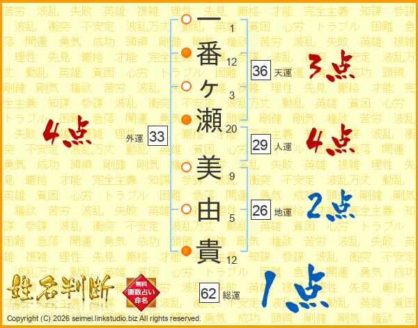 一(1画)番(12画)ヶ(3画)瀬(20画) 美(9画)由(5画)貴(12画)
