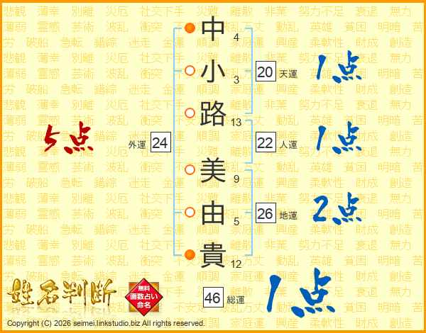 中(4画)小(3画)路(13画) 美(9画)由(5画)貴(12画)
