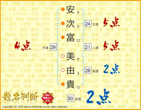 安(6画)次(6画)富(12画) 美(9画)由(5画)貴(12画)