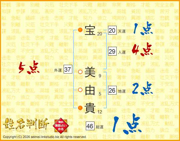 生活面を象徴する運勢です。外部から受ける影響力を表し、結婚運、家庭運や職場、環境への順応性を表します。総運から人運を引いた画数。姓や名が1文字の場合を除く。