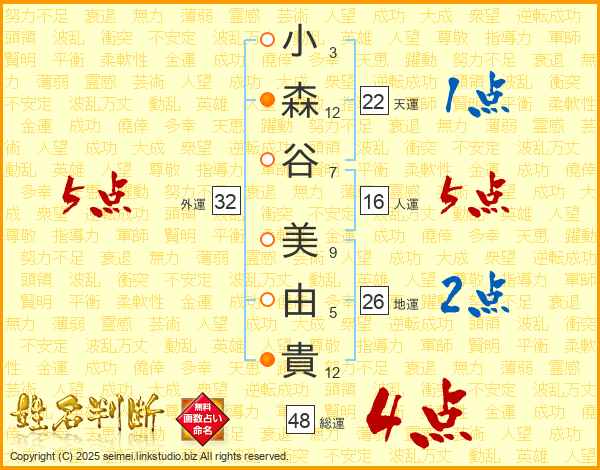 小(3画)森(12画)谷(7画) 美(9画)由(5画)貴(12画)