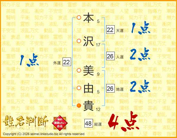 本(5画)沢(17画) 美(9画)由(5画)貴(12画)