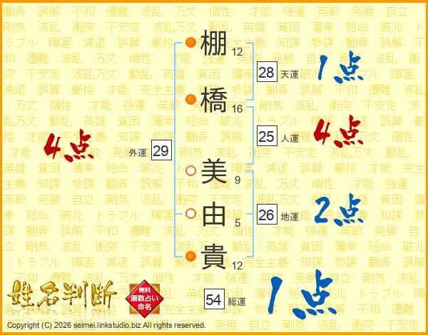 棚(12画)橋(16画) 美(9画)由(5画)貴(12画)