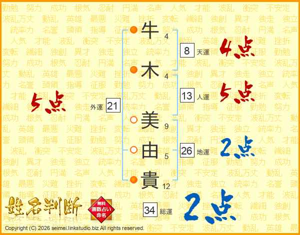 牛(4画)木(4画) 美(9画)由(5画)貴(12画)