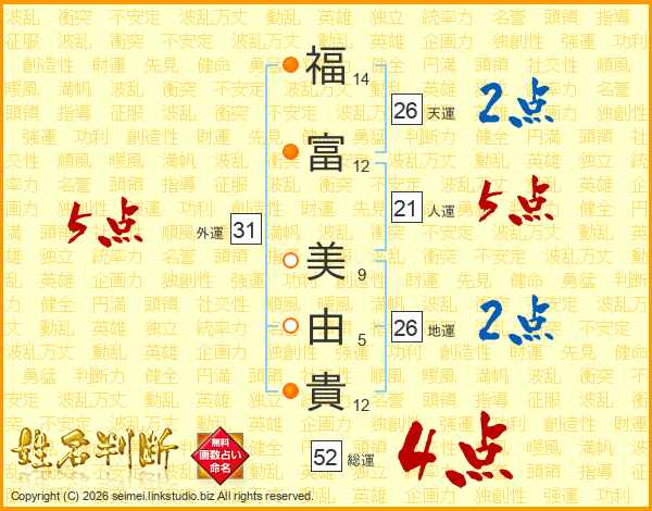福(14画)富(12画) 美(9画)由(5画)貴(12画)