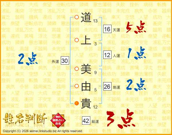 道(13画)上(3画) 美(9画)由(5画)貴(12画)