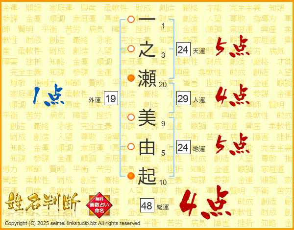 一(1画)之(3画)瀬(20画) 美(9画)由(5画)起(10画)
