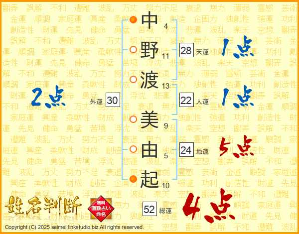 中(4画)野(11画)渡(13画) 美(9画)由(5画)起(10画)