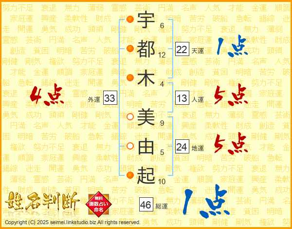 宇(6画)都(12画)木(4画) 美(9画)由(5画)起(10画)