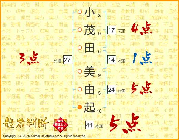 小(3画)茂(9画)田(5画) 美(9画)由(5画)起(10画)
