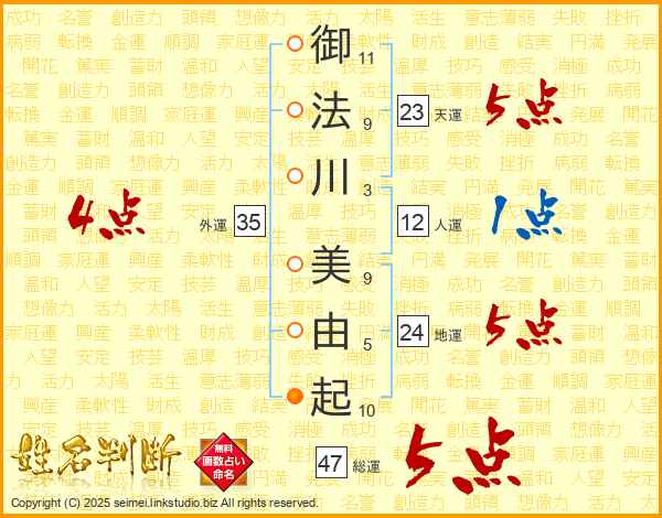 御(11画)法(9画)川(3画) 美(9画)由(5画)起(10画)