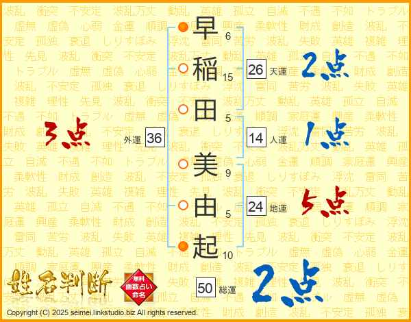 早(6画)稲(15画)田(5画) 美(9画)由(5画)起(10画)