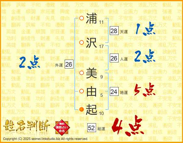 浦(11画)沢(17画) 美(9画)由(5画)起(10画)