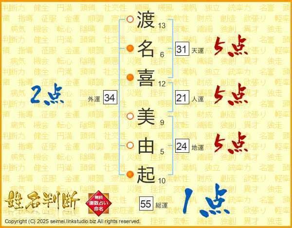 渡(13画)名(6画)喜(12画) 美(9画)由(5画)起(10画)