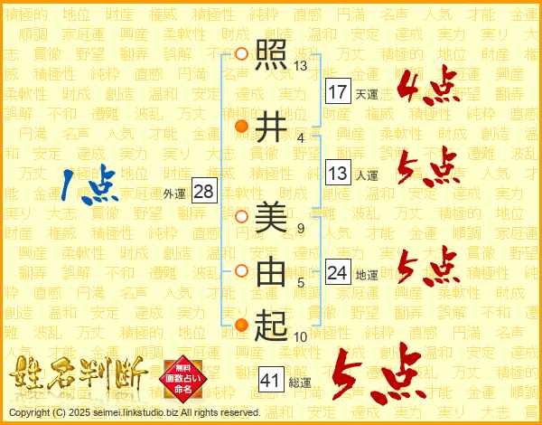 照(13画)井(4画) 美(9画)由(5画)起(10画)