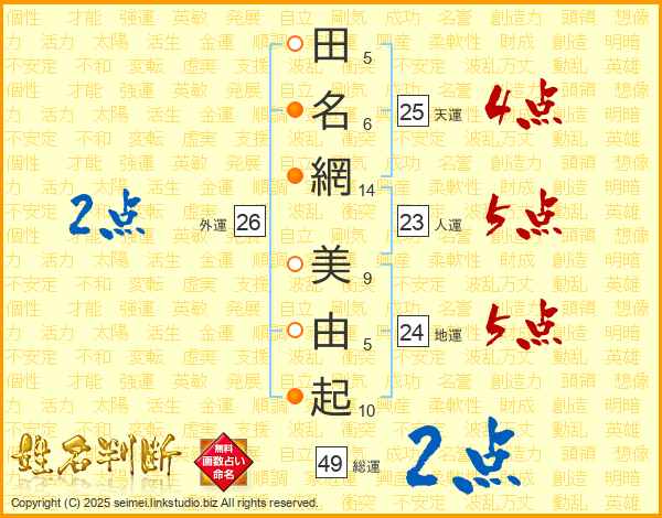 田(5画)名(6画)網(14画) 美(9画)由(5画)起(10画)