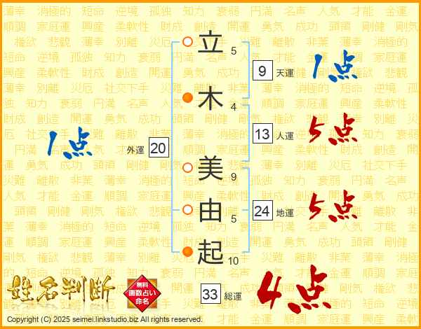 立(5画)木(4画) 美(9画)由(5画)起(10画)
