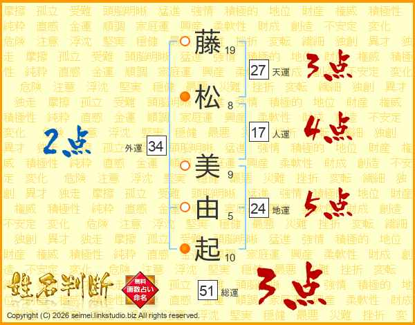 藤(19画)松(8画) 美(9画)由(5画)起(10画)