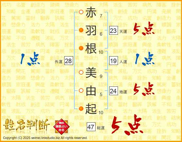 赤(7画)羽(6画)根(10画) 美(9画)由(5画)起(10画)