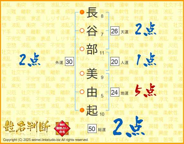 長(8画)谷(7画)部(11画) 美(9画)由(5画)起(10画)