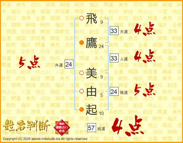 飛(9画)鷹(24画) 美(9画)由(5画)起(10画)
