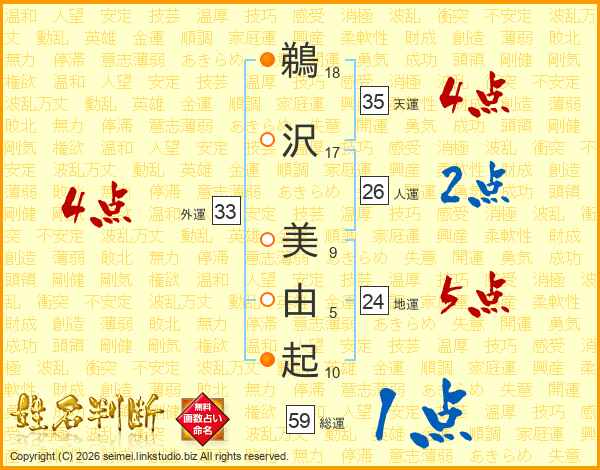 鵜(18画)沢(17画) 美(9画)由(5画)起(10画)