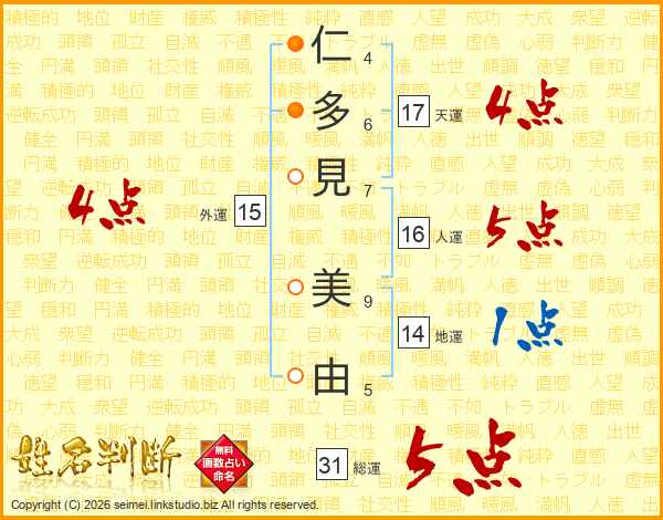 仁(4画)多(6画)見(7画) 美(9画)由(5画)