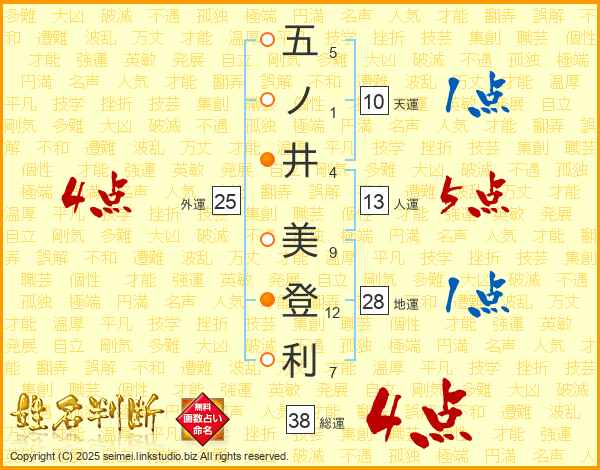 生活面を象徴する運勢です。外部から受ける影響力を表し、結婚運、家庭運や職場、環境への順応性を表します。総運から人運を引いた画数。姓や名が1文字の場合を除く。