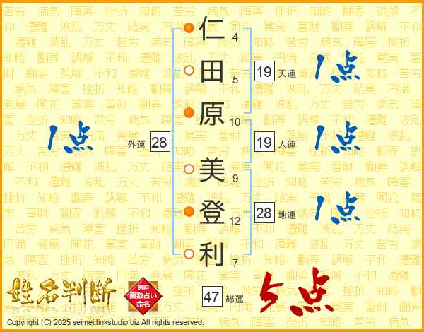仁(4画)田(5画)原(10画) 美(9画)登(12画)利(7画)
