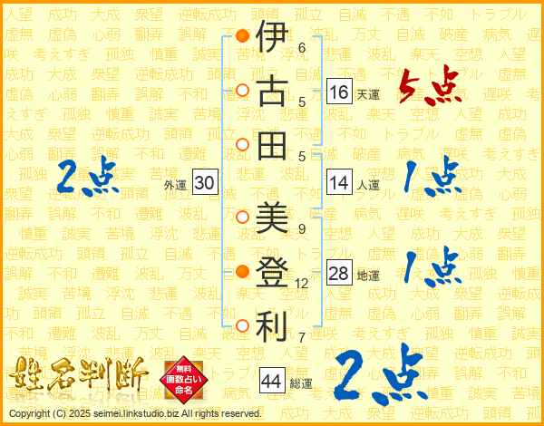 伊(6画)古(5画)田(5画) 美(9画)登(12画)利(7画)