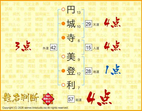 円(13画)城(10画)寺(6画) 美(9画)登(12画)利(7画)