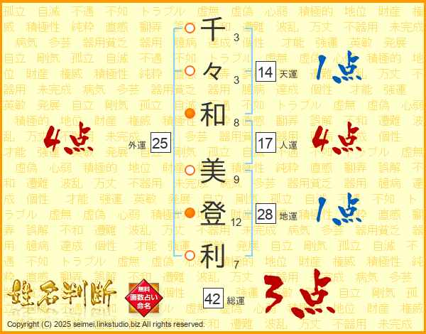 千(3画)々(3画)和(8画) 美(9画)登(12画)利(7画)