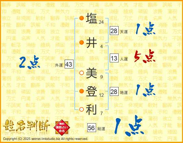 塩(24画)井(4画) 美(9画)登(12画)利(7画)