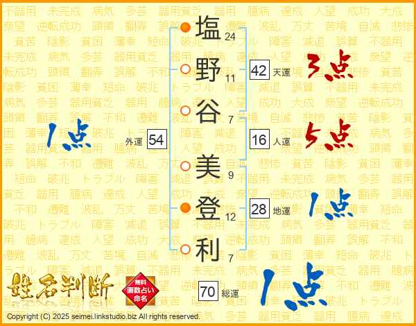 塩(24画)野(11画)谷(7画) 美(9画)登(12画)利(7画)