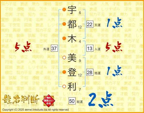 宇(6画)都(12画)木(4画) 美(9画)登(12画)利(7画)