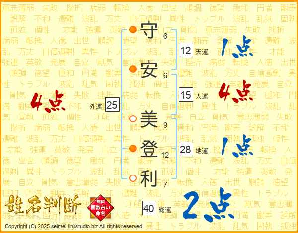 守(6画)安(6画) 美(9画)登(12画)利(7画)