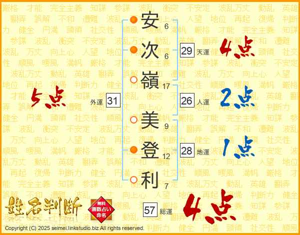 安(6画)次(6画)嶺(17画) 美(9画)登(12画)利(7画)