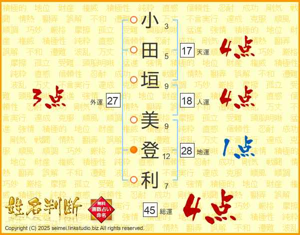 小(3画)田(5画)垣(9画) 美(9画)登(12画)利(7画)