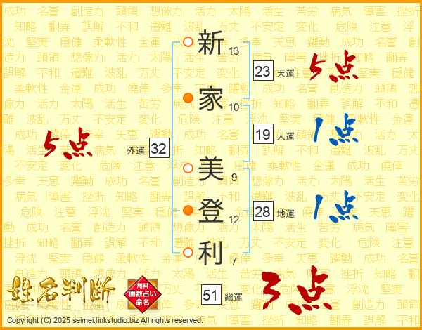新(13画)家(10画) 美(9画)登(12画)利(7画)