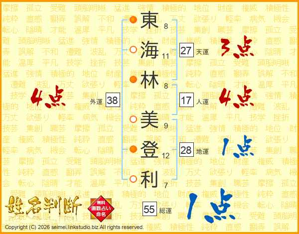 東(8画)海(11画)林(8画) 美(9画)登(12画)利(7画)