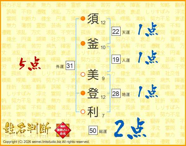 須(12画)釜(10画) 美(9画)登(12画)利(7画)