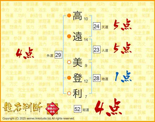高(10画)遠(14画) 美(9画)登(12画)利(7画)
