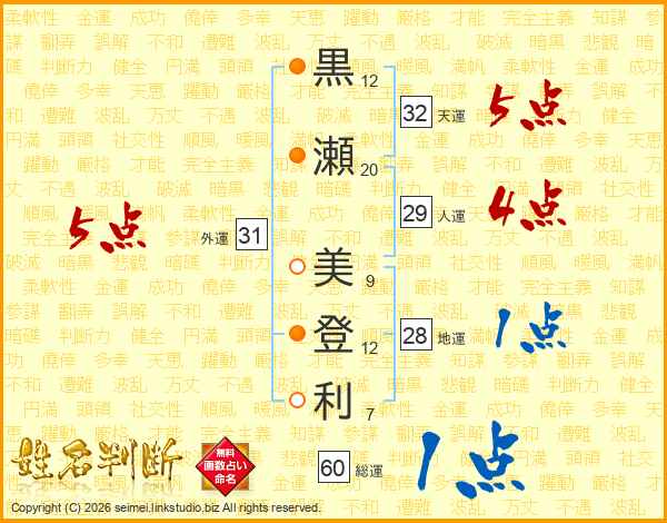 黒(12画)瀬(20画) 美(9画)登(12画)利(7画)