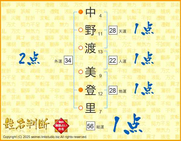 中(4画)野(11画)渡(13画) 美(9画)登(12画)里(7画)