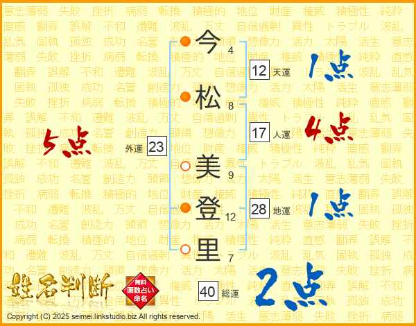 今(4画)松(8画) 美(9画)登(12画)里(7画)