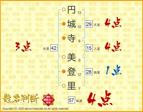 円(13画)城(10画)寺(6画) 美(9画)登(12画)里(7画)