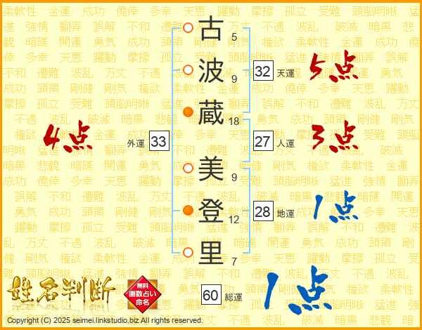 古(5画)波(9画)蔵(18画) 美(9画)登(12画)里(7画)