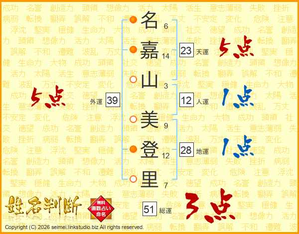 名(6画)嘉(14画)山(3画) 美(9画)登(12画)里(7画)