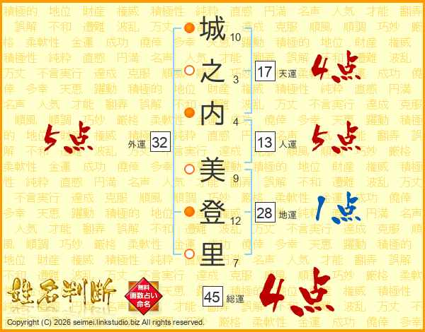城(10画)之(3画)内(4画) 美(9画)登(12画)里(7画)